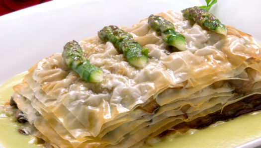 INGREDIENTES 5 láminas de pasta filo 1 kg de champiñón laminado 1 manojo de ajos frescos 2 cebolletas 12 espárragos verdes 1 patata agua aceite de oliva virgen extra mantequilla sal 1 trozo de guindilla picante ELABORACIÓN Para hacer la salsa, debemos de picar los espárragos (reservamos 8 puntas) y la patata peleada. Los echamos…