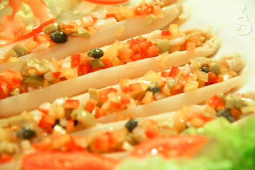 INGREDIENTES 1 Ud. de Espárrago blanco ( en lata) 1 Ud. de Cebolla 1/2 Ud. de Pimiento rojo, crudo 1/2 Ud. de Pimiento amarillo, crudo 1 Puñado(s) de Aceituna verde rellena de anchoa 1/2 Puñado(s) de Alcaparra Para la salsa Aceite de oliva virgen extra Salsa de soja Aceite de sésamo Vinagre de Módena ELABORACIÓN Cortamos las verduras y aceitunas en trocitos muy pequeños ya que luego…