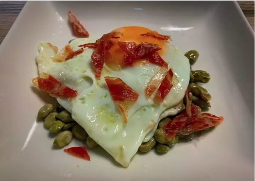 Habitas Baby Salteadas con Jamón y Huevos Escalfados