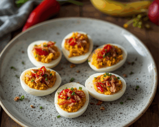 INGREDIENTES ( 2 – 3 personas ) 6 huevos cocidos 2 latas de atún en aceite (bien escurridas) 3 pimientos del piquillo de Conservas El Escolar 4 cucharadas de mayonesa 1 cucharadita de mostaza suave (opcional) Sal y pimienta negra Aceite de oliva virgen extra Cebollino, perejil o pimiento picado para decorar ELABORACIÓN Cocer los…