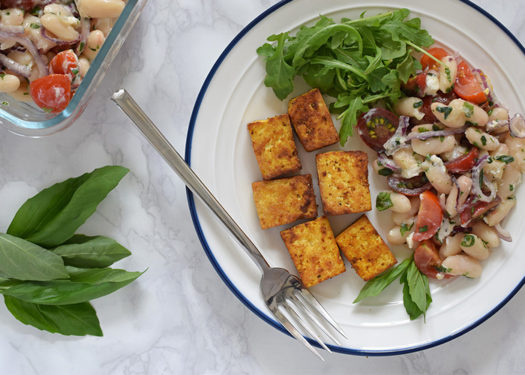 INGREDIENTES Tofu firme escurrido – 275 g Mezcla de especias de curry – 1 cucharadita Mostaza – 5 ml Vinagre de manzana o Jerez – 20 ml Salsa de soja baja en sal – 5 ml Salsa picante opcional – 2 ml Alubias blancas cocidas – 400 g Cebolla morada – 1 Tomates cherry variados – 15 Albahaca fresca en hojas – 5 Queso de rulo de cabra en medallones…